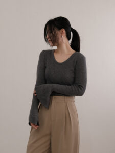 Crafted from a soft and stretchy knit fabric, this stylish top features bell sleeves that add a touch of flair and femininity. The sleeves flare out gracefully, creating a playful and fashion-forward silhouette. This versatile piece can be paired seamlessly with high-waisted jeans or skirts for a trendy and relaxed look, making it a go-to choice for those seeking a fashionable yet comfortable wardrobe staple.