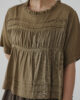 An airy linen–cotton blend blouse designed with a gentle ruffle neckline and gathered pleats for subtle volume. Cropped in length with short sleeves, it feels light and breathable which is perfect for warm days and easy layering.